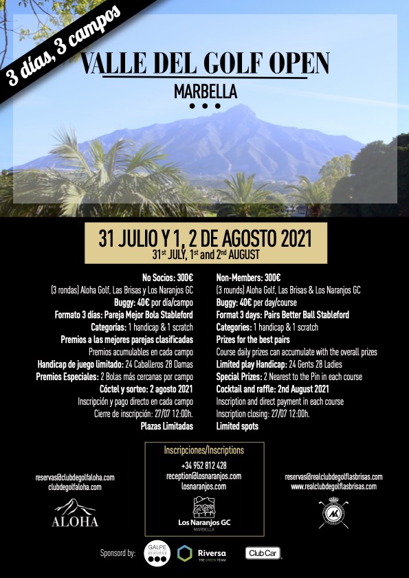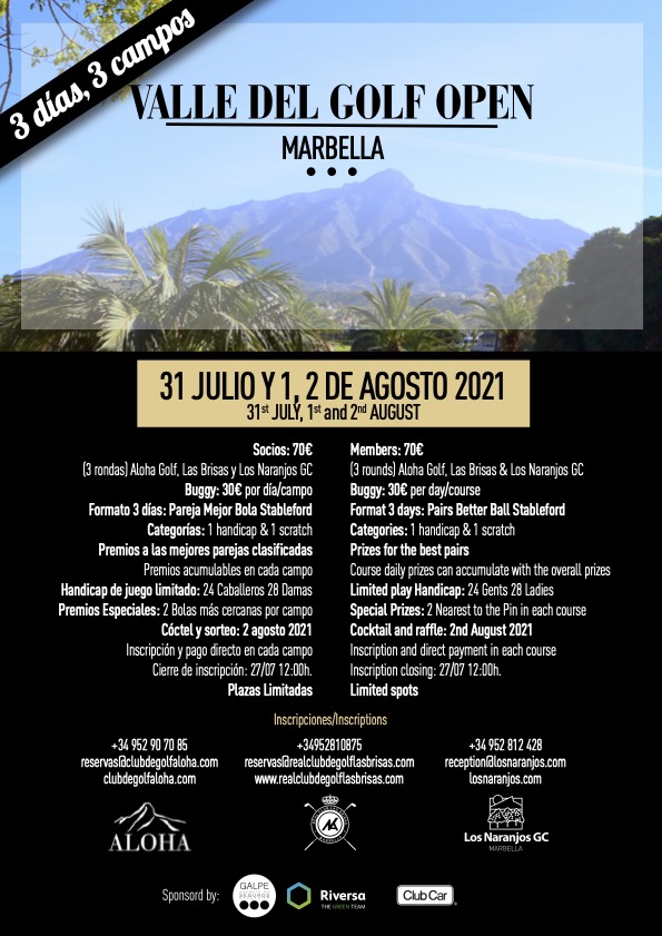 Galpe Agencia de Seguros forma parte de uno de los eventos más importantes en el mundo del golf de la Costa del Sol. No podíamos negarnos a ser parte del “Valle de Golf Open”, un torneo de golf a 3 días y en 3 de los mejores campos de la provincia de Málaga. Si este verano quieres jugar en Los Naranjos Golf, Aloha Golf y el Real Club La Brisas, esta es tu oportunidad!!!. Si eres de los que te gusta el buen golf, no te puedes perder este Torneo!!!